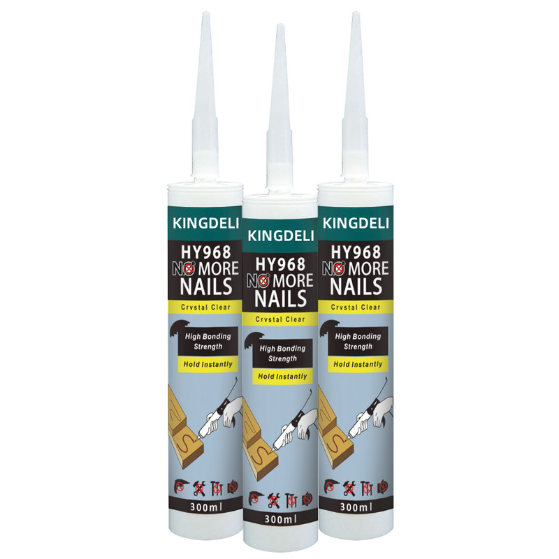 HY-968 อเนกประสงค์ No More Nailsเป็นกาวสำหรับงานก่อสร้างที่มีส่วนประกอบเดียว เกรดภายนอก ใช้ตัวทำละลาย มีความแข็งแรงสูง แห้งตัวเร็วใช้ยางสังเคราะห์คุณภาพสูง เพื่อขจัดการตอกตะปูที่จำเป็นสำหรับการตกแต่งภายนอกและวัตถุประสงค์ในการก่อสร้าง ผลิตภัณฑ์นี้แสดงคุณลักษณะต่อไปนี้: